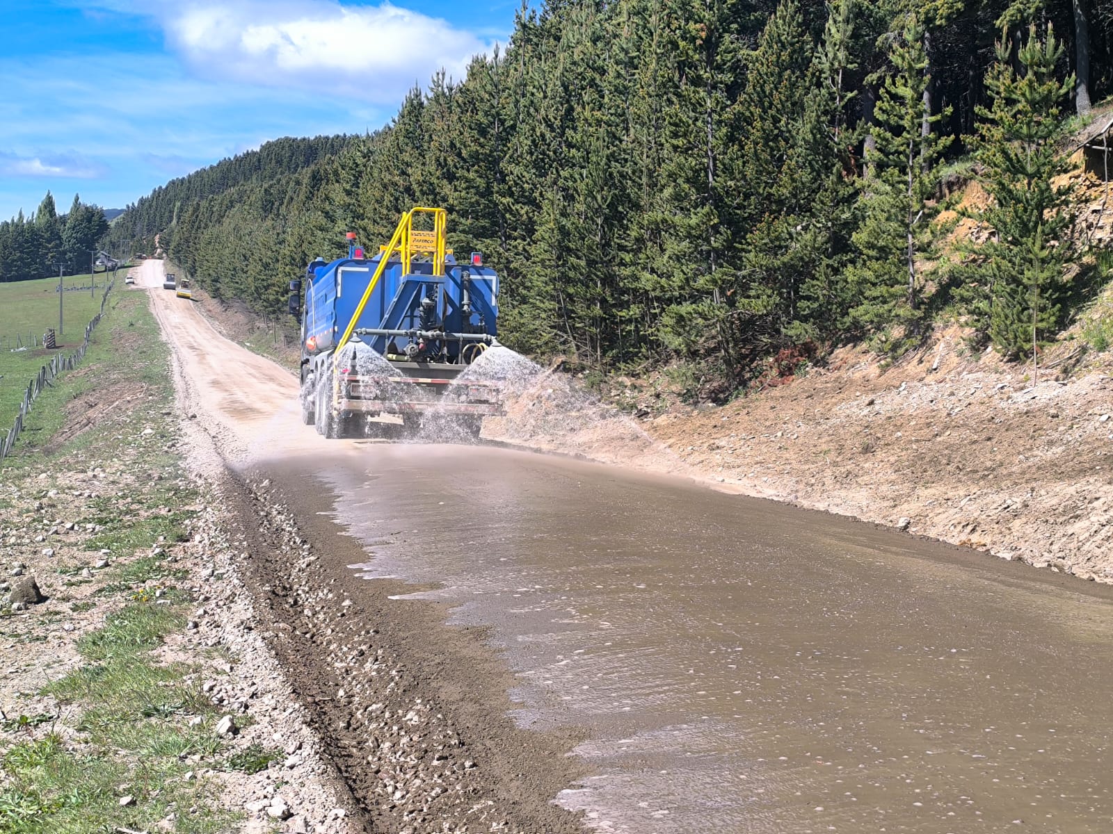 Se usa una técnica especial con productos que refuerzan el suelo, evitando que la carretera se hunda o se agriete fácilmente, haciendo que dure más tiempo en buenas condiciones.